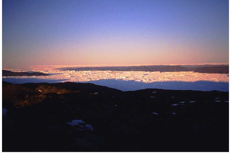 Опівнічний вид на льодовиковий щит Гренландії біля Ілуліссата в липні 1991 року. На задньому плані видно величезний льодовиковий щит, тоді як фіорд на передньому плані забитий айсбергами, випущеними одним з найшвидше рухомих вивідних льодовиків у світі. Під час останнього льодовикового періоду цей льодовиковий щит був безпосередньо пов’язаний з крижаними масами, що вкривали більшу частину Канади. Фото: Торбйорн Торнквіст/Тулейнський університет