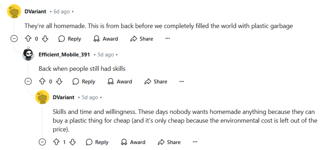 “Це було ще до того, як ми повністю заповнили світ пластиковим сміттям. Навички, час і бажання. У наші дні ніхто не хоче нічого домашнього, тому що можна купити пластикові речі дешево (дешево лише тому, що не враховуються втрати для екології)”, — зазначив коментатор.