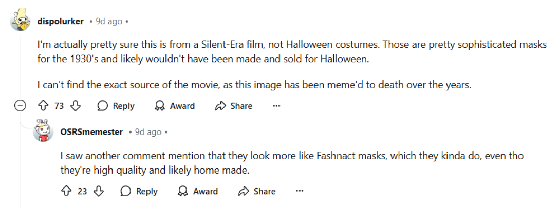 “Насправді я майже впевнений, що це фільм німої епохи, а не костюми на Геловін. Це досить складні маски для 1930-х років, і, швидше за все, їх не виготовили б і не продали на свято. Я не можу знайти точне джерело фільму, оскільки протягом багатьох років це зображення часто використовували в мемах”, — висловив думку один із коментаторів.