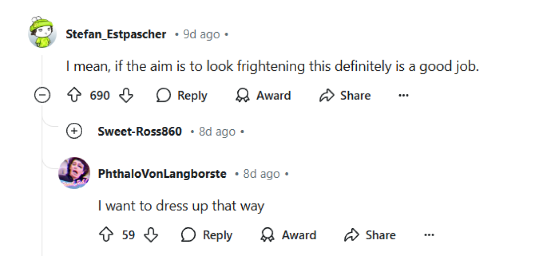 “Я вважаю, якщо мета — виглядати страхітливо, то це безперечно хороша робота”, — написав один із коментаторів під фото.