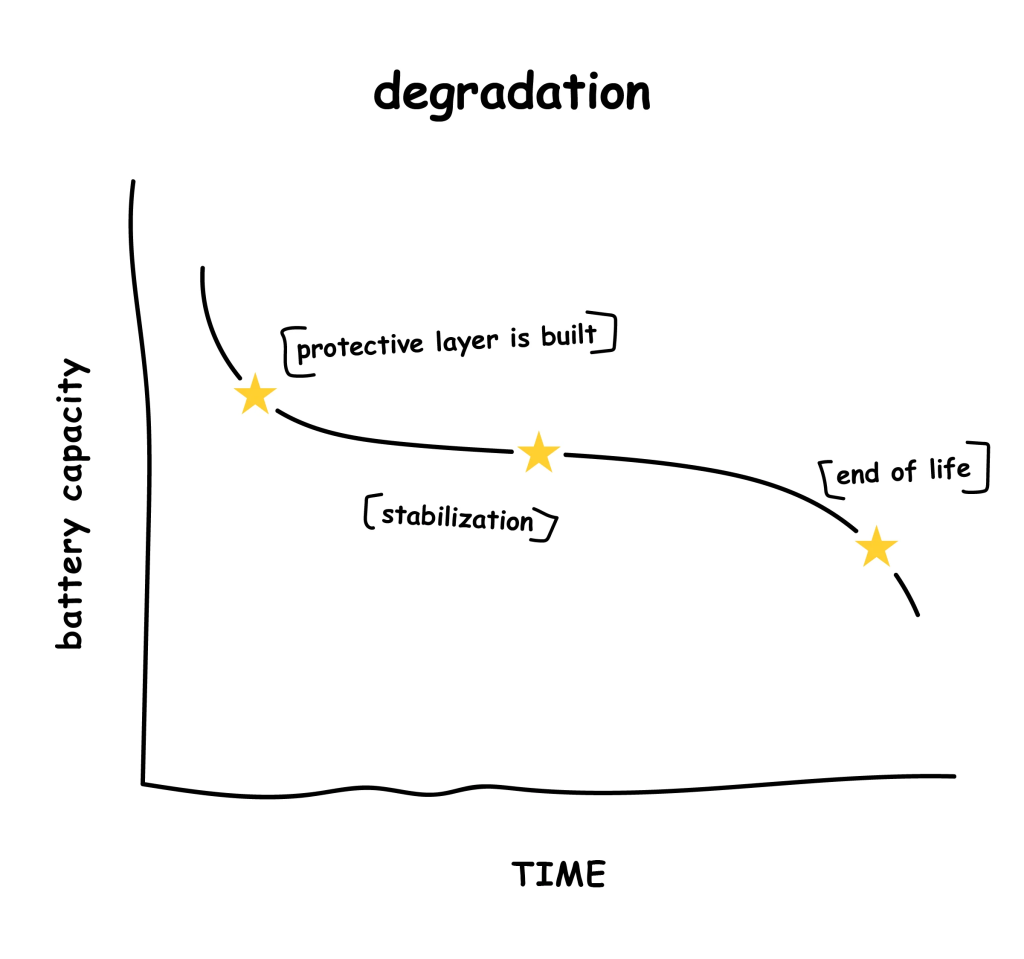 Як правило, літій-іонні батареї деградують за S-подібною кривою. Коли батарея нова, може спостерігатися деяка помітна деградація, оскільки вона досягає свого стаціонарного стану. Після цього настає тривалий період повільного, лінійного старіння, а потім різке зниження, коли батарея розряджається.