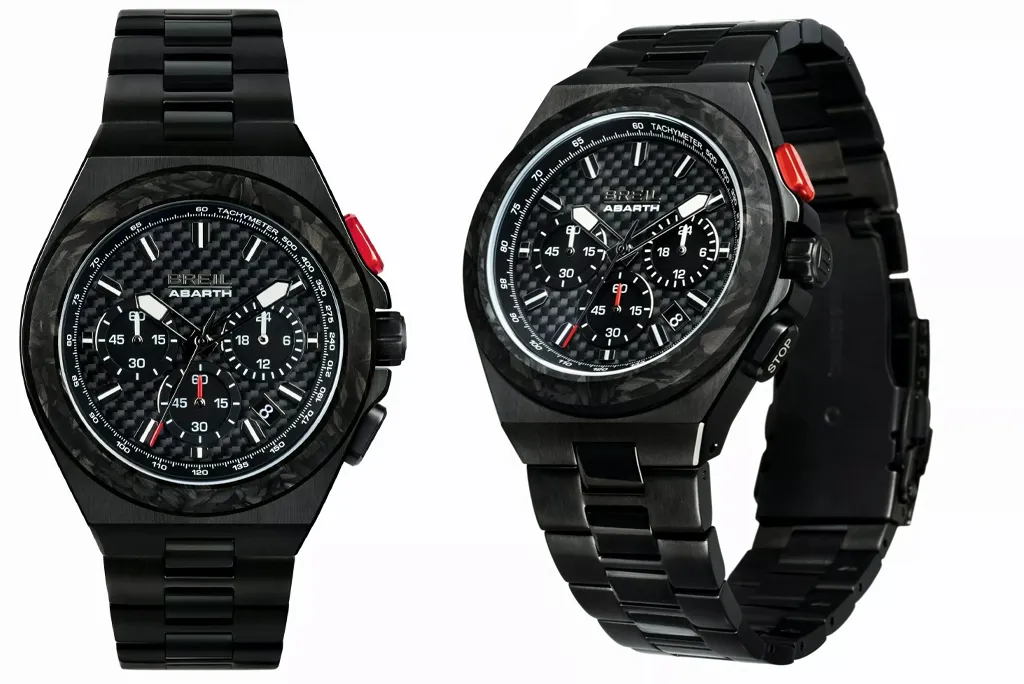 Хронограф Breil Abarth 1000, виконаний у чорному корпусі з нержавіючої сталі в поєднанні з кованим і традиційним вуглецевим волокном, має кнопки запуску та зупинки, розташовані в положеннях “2 години” та “4 години”. Крім того, стрілки виготовлені з титану та покриті люмінесцентним складом. Передню частину захищає сапфірове скло, а на задній кришці знаходиться серійний номер годинника та гравіювання «1965-2025, Abarth 1000, 60 anni di storia». Водонепроникність годинника складає близько 100 м, а їх вага – всього 50 г.