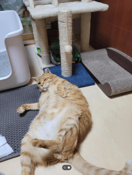 На іншому зображенні кіт лежав неподалік кігтеточки. Тварина з сяючою, пухнастою шкірою виглядає абсолютно здоровою.