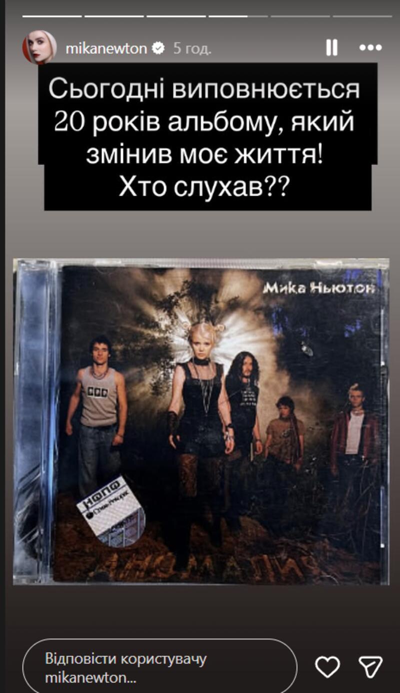 Відома українська виконавиця Міка Ньютон, справжнє ім’я якої Оксана Грицай, розповіла шанувальникам про визначну подію у її кар’єрі. У понеділок, 24 листопада, учасниця Євробачення-2011 відсвяткувала 20-річчя від дня виходу її альбому «Аномалія».