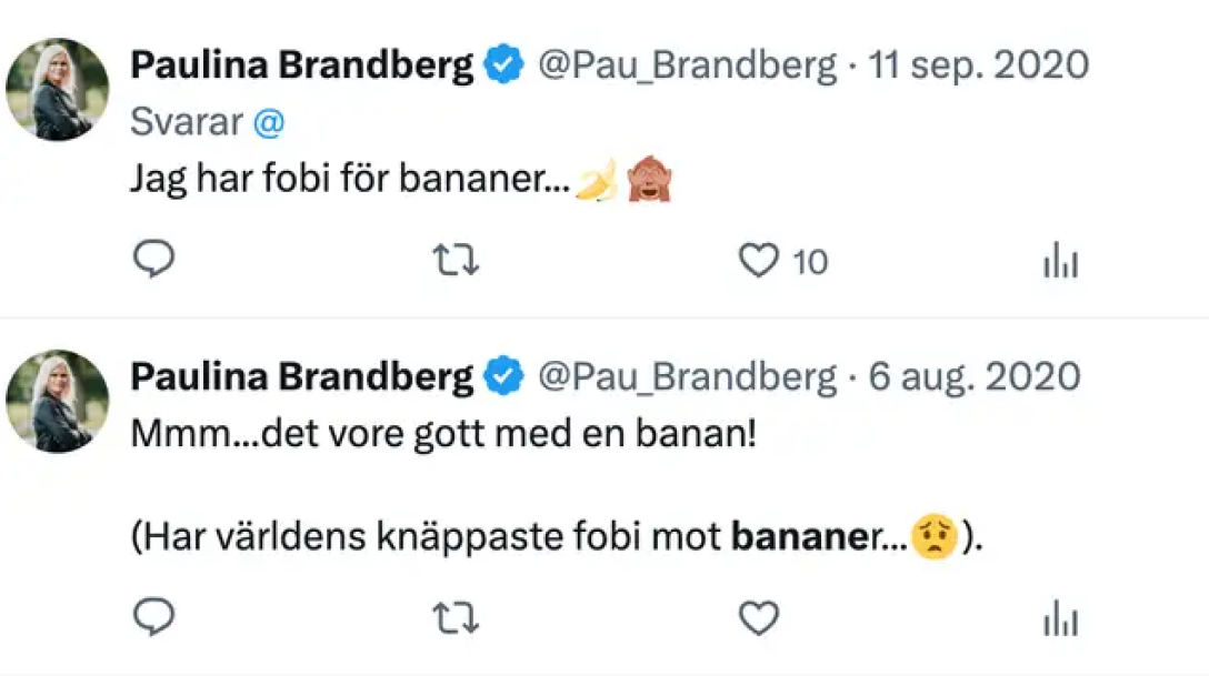“У мене бананофобія”, – написала Брандберг в одному дописі від 11 вересня 2020 року. В іншому пості від 6 серпня 2020 року вона заявила, що це “найбожевільніша фобія у світі”.