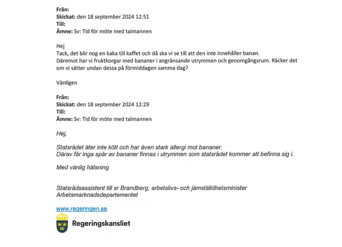 Третій з відомих листів був спікеру шведського парламенту Андреасу Норлену. Співробітників його канцелярії просили, аби було бути “жодних слідів бананів” на момент візиту пані Брандберг.