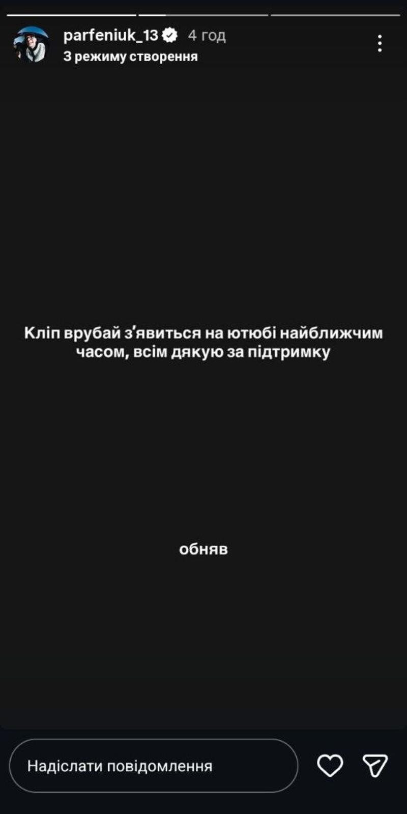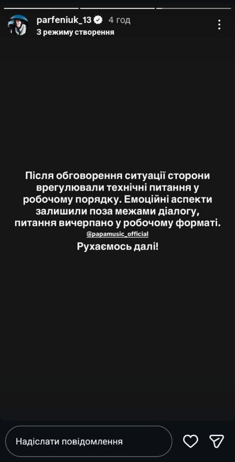 «Після обговорення ситуації сторони врегулювали технічні питання у робочому порядку. Емоційні аспекти залишилися поза межами діалогу, питання вичерпано у робочому форматі. Рухаємось далі! Кліп “Врубай” з’явиться на ютубі найближчим часом, всім дякую за підтримку. Обняв», — написав він, зазначивши акаунт Papa Music.