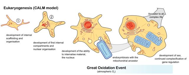 Мітохондрії з’явилися значно пізніше — близько 2,2 млрд років тому — вже під час зростання рівня атмосферного кисню. Це свідчить, що складні клітини існували до Великої оксидаційної події, але потребували екологічного поштовху для подальшої диверсифікації. Таке пізнє злиття передбачає багатоступеневий перехід від простих архей до повноцінних еукаріотів.