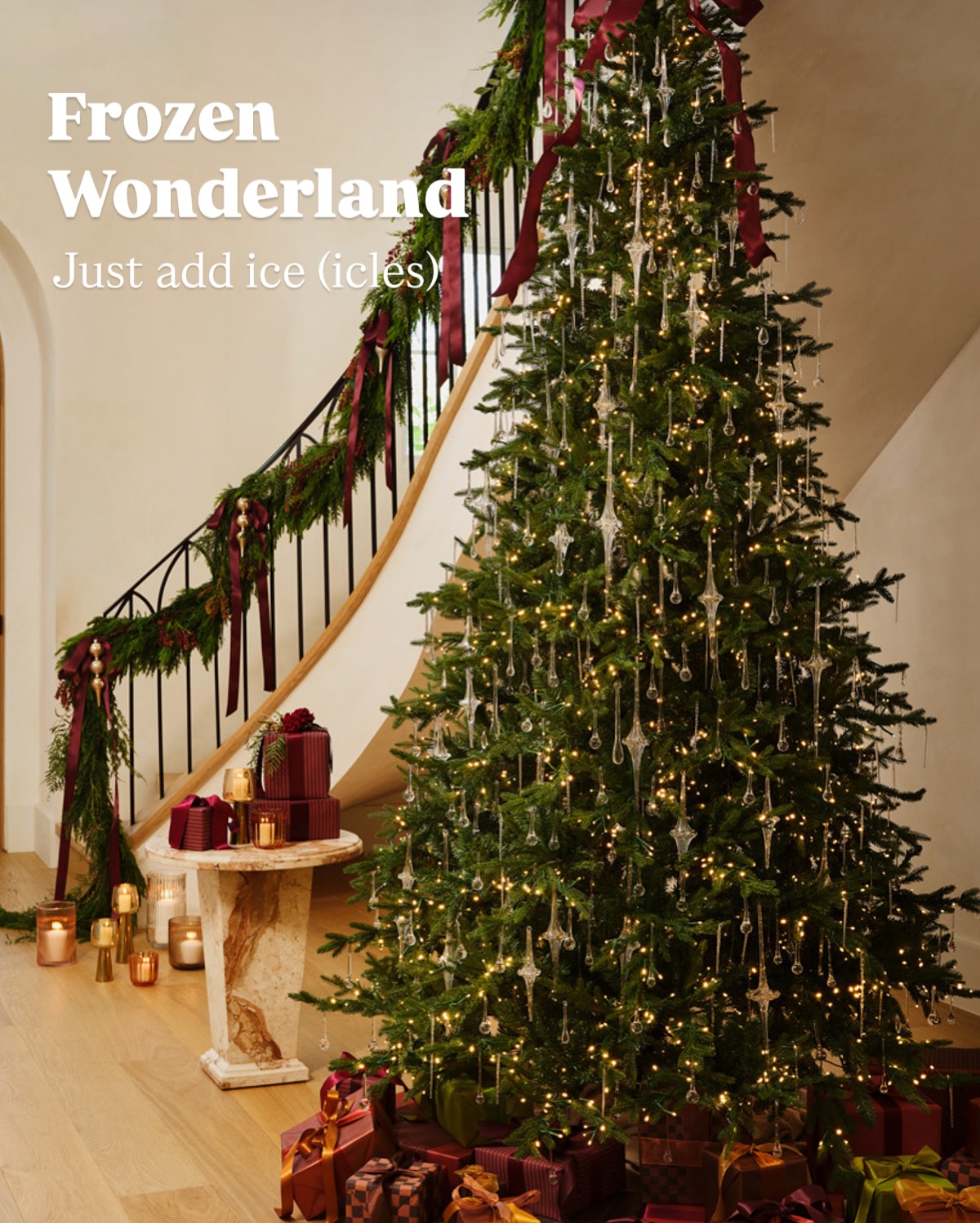«Заморожена» ялинка — прозорі іграшки та гірлянди у вигляді прозорих капель та бурульок