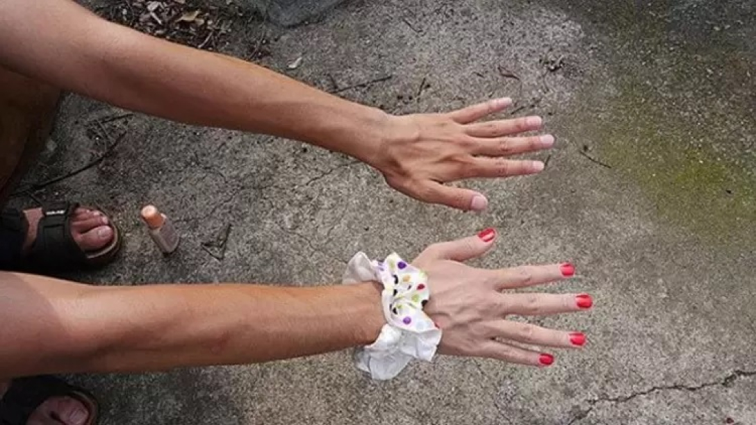 “Я наніс на руку тональну основу і покрив нігті лаком, щоб імітувати м’яку, блискучу жіночу руку, і це має чудовий вигляд, якщо одягнути на зап’ястя гумку для волосся”, — пояснив він.