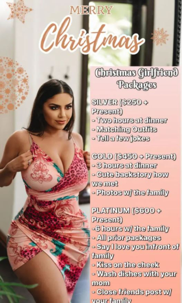 Модель з Маямі (США) представила у своїх соціальних мережах три “Різдвяні пакети”. Їхня вартість стартує зі 150 доларів за годину.