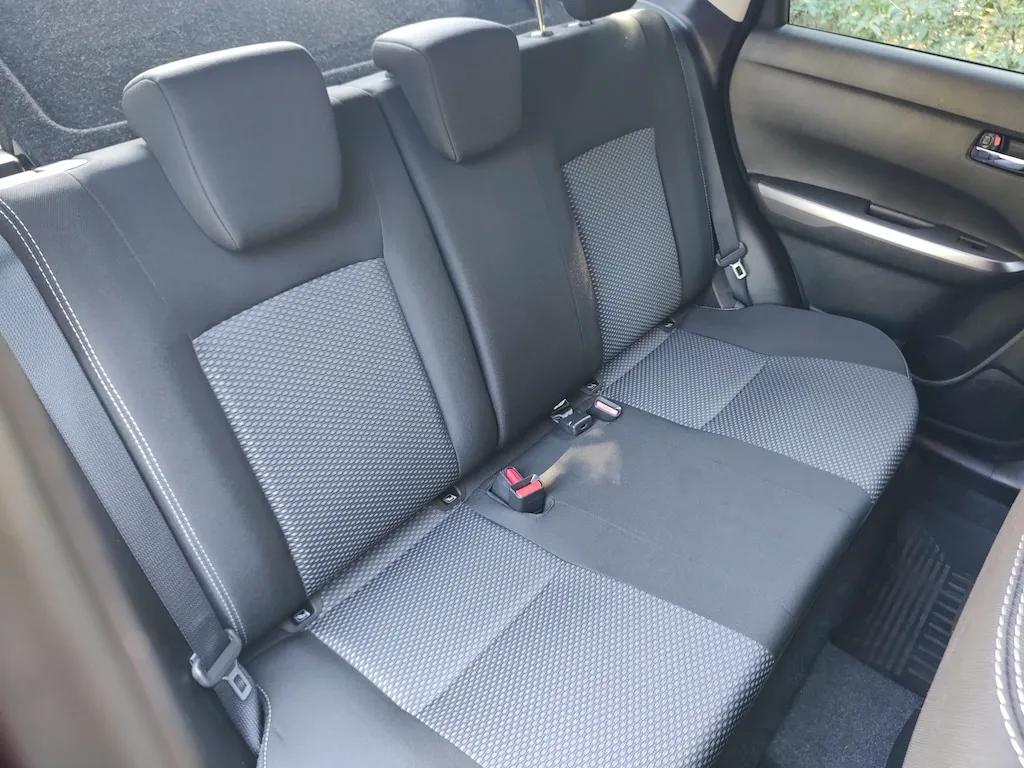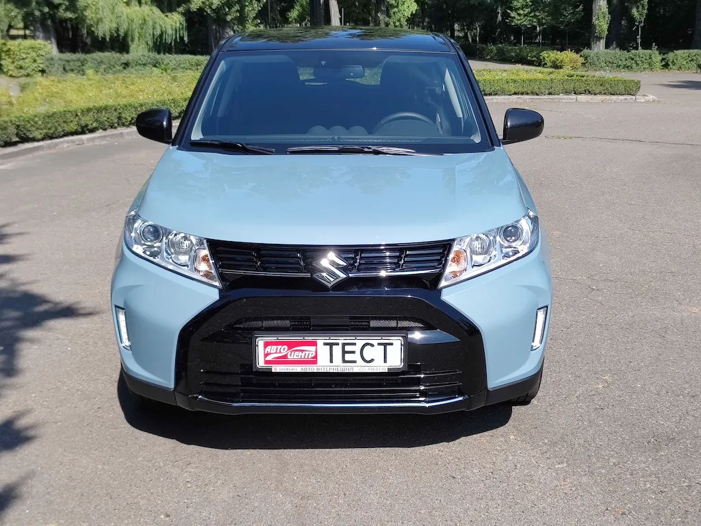 Suzuki Vitara отримала оновлення як екстер’єру, так і інтер’єру. Зовні змінилась решітка радіатора, центральний фрагмент бампера та стало менше сріблястих елементів. І чорний у поєднанні з небесно-блакитним кольором гармоніює дуже добре. До речі, до палітри далося 2 нових кольори, а усього тепер є 10 варіантів. Ну й двоколірне забарвлення, яке було доступне і раніше. Знову ж таки, чорні елементи по центру вдало поєднуються з чорним дахом. Щодо оптики, то тут в середній комплектації в нас галогенові фари, а у топовій будуть вже повністю світлодіодні. Світло дуже непогане і воно не жовте, а практично біле.