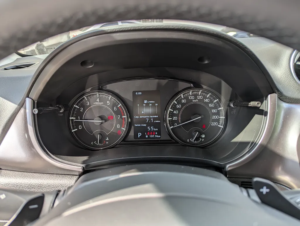 Приладова панель тут комбінована – є аналоговий тахометр та спідометр, а між ними знаходиться чималенький цифровий екран з різноманітною оперативною інформацією: витрати пального, запас ходу тощо, і цих параметрів, які можна побачити, дійсно багато. Є покажчики крутного моменту та потужності, наскільки ви використовуєте потенціал автомобіля. Є навіть показник перенавантаження G…
