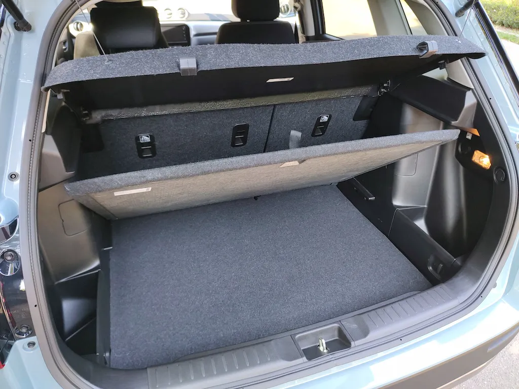 Також маємо додатково дві кишеньки з протилежного боку, гачки для якоїсь фіксації, «прикурювач» на 120 Вт, світло, а з іншого боку такий, я б сказав, міцніший гачок, на нього теж можна щось прилаштувати за необхідності. У такому положенні нас складається спинка заднього сидіння в один рівень із підлогою багажника. А якщо ми переставляємо нижче, ми відповідно отримуємо більше простору. Поріг тут мінімальний і ви не подряпаєте багажник, і легше буде навантажувати та вивантажувати, що ви з собою взяли у подорож.
