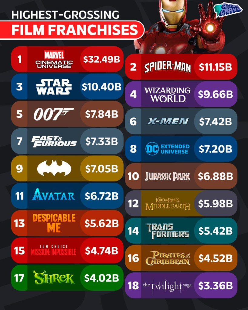 Посівши 11-те місце ($6.72 млрд), франшиза Джеймса Кемерона показує неймовірну ефективність. Маючи лише кілька фільмів, вона обходить за прибутковістю серії, що налічують десятки стрічок.