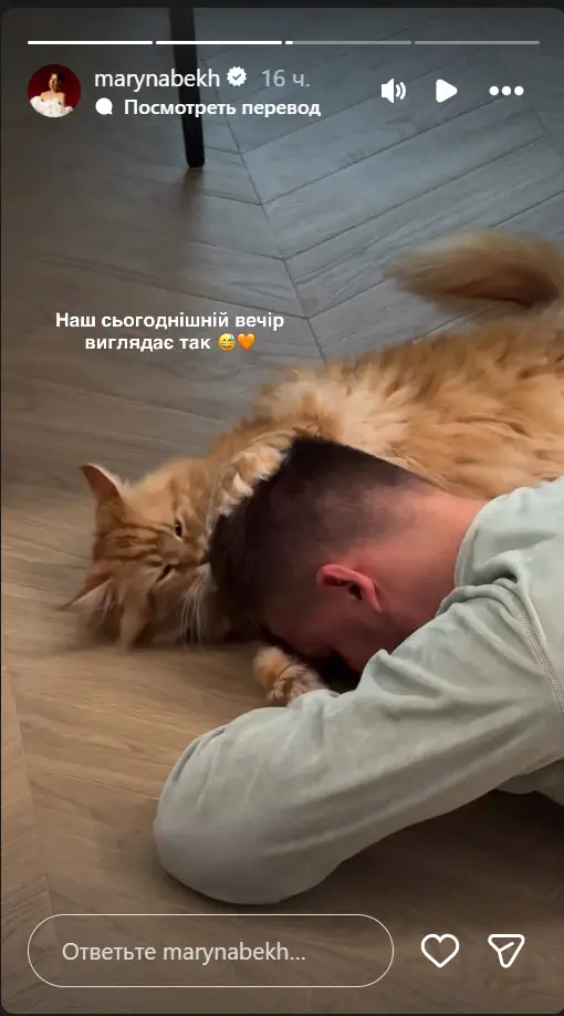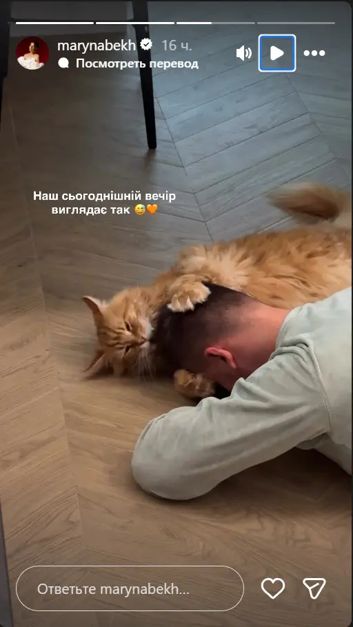 Дівчина опублікувала ролик, у якому продемонструвала зворушливу сцену з чоловіком Михайлом та їхнім домашнім улюбленцем — котом породи мейн-кун. На відео кіт лежить на підлозі, обіймаючи лапами голову Михайла, що лежить поруч, і енергійно облизує йому волосся. У підписі до публікації зазначено: “Наш сьогоднішній вечір виглядає так 😅🧡”.