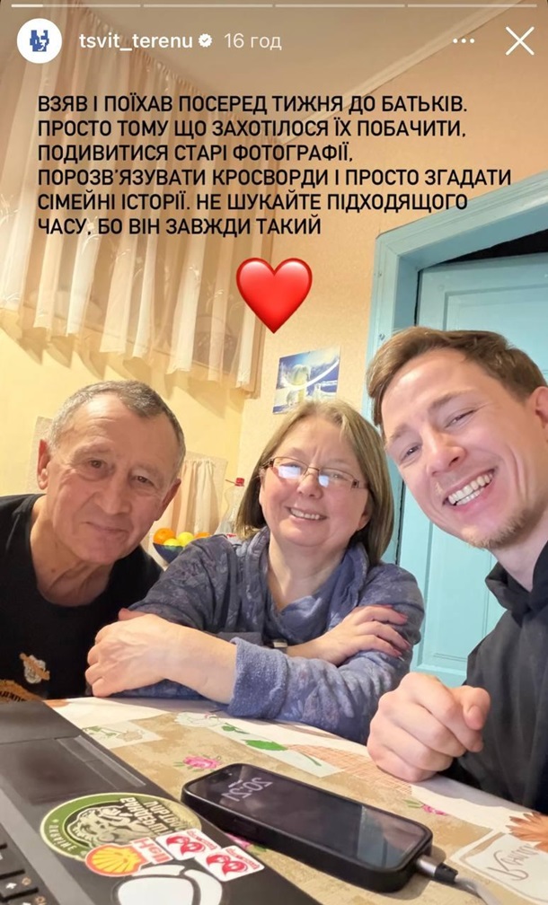 «Взяв і поїхав посеред тижня до батьків. Просто тому, що захотілося їх побачити. Подивитися старі фотографії, порозв’язувати кросворди й просто згадати сімейні історії. Не шукайте підхожого часу, бо він завжди такий», — написав Терен.