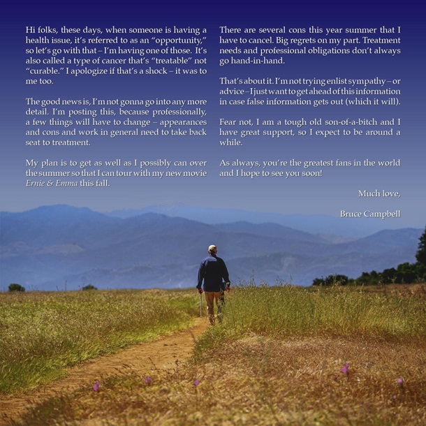 Зірка фільмів Зловісні мерці зізнався, що лікарі виявили у нього рак, який піддається лікуванню, але не є повністю виліковним. Актор заявив, що змінить робочий графік і зосередиться на боротьбі з хворобою.