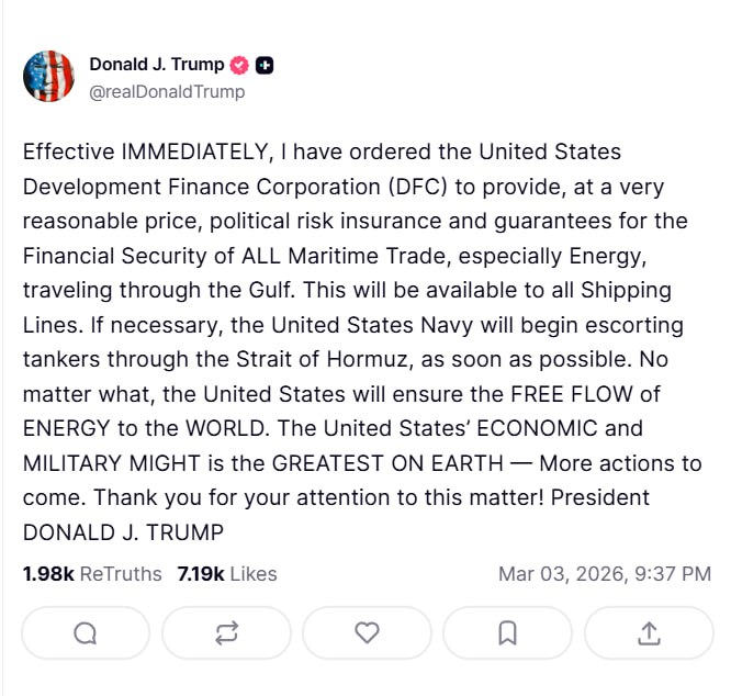 “Я доручив Корпорації фінансування міжнародного розвитку США негайно забезпечити за дуже помірною ціною страхування політичних ризиків і гарантії фінансової безпеки ВСІЄЇ морської торгівлі, особливо постачання енергоресурсів через Перську затоку. Ці механізми будуть доступні для всіх судноплавних компаній.