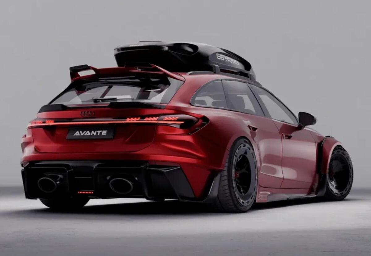 На рендерах модель отримала розширені колісні арки, масивні пороги, новий передній бампер і капот із вентиляційними отворами. Ззаду встановлені великий дифузор, два спойлери та додатковий стоп-сигнал. Образ доповнюють занижена підвіска, незвичайні колісні диски, матовий червоний колір кузова, чорні акценти та багажний бокс на даху. Хоча це лише цифрова візуалізація, вона показує, як ефектно може виглядати RS5 Avant у більш агресивному стилі.
