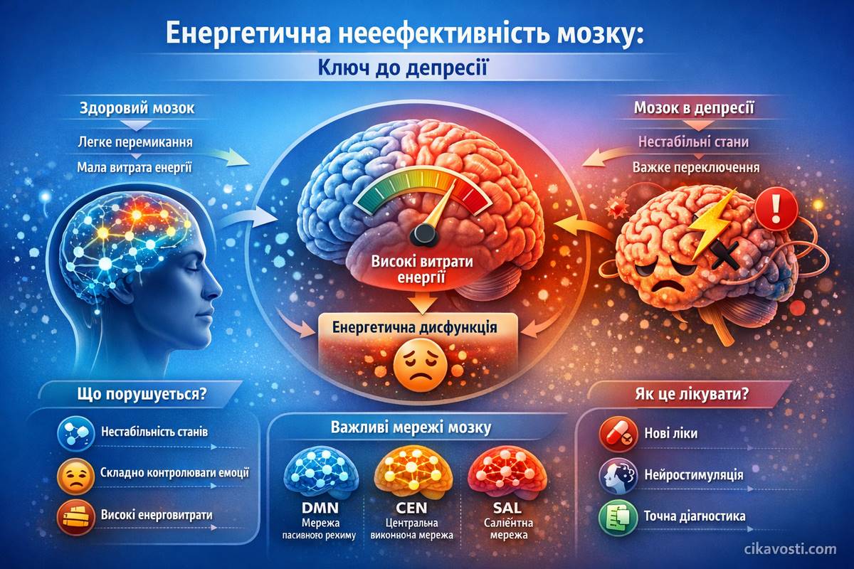 Депресія — одне з найпоширеніших і найскладніших психічних захворювань. Традиційно її пояснювали дисбалансом нейромедіаторів — серотоніну, дофаміну, норадреналіну. Але нове дослідження, опубліковане в Translational Psychiatry, пропонує принципово інший погляд: при великому депресивному розладі (ВДР) мозок не просто «хімічно розбалансований» — він фізично застряг у несприятливому стані через надмірно високі енергетичні бар’єри для переходу до здорових конфігурацій. Ця підвищена «вартість виходу» може пояснити, чому захворювання таке стійке — і відкриває нові мішені для терапії.