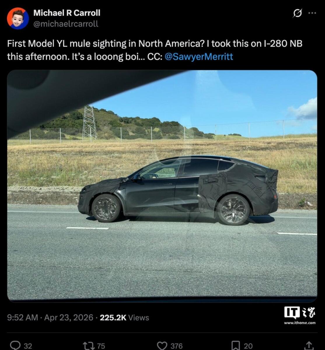 Днями в мережі випливла цікава публікація: інсайдер Michael R. Carroll виклав пост зі знімком прототипу Tesla Model YL 2027. Автомобіль, як уточнюють очевидці, був помічений в районі затоки Сан-Франциско в США. На перший погляд це звичайна шпигунська фотографія, але вона чіпляє іншим.