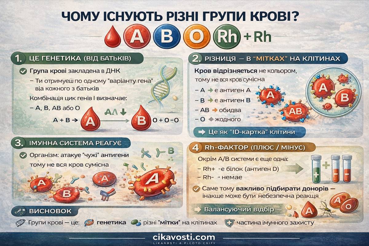 Якщо ви колись здавали кров на аналіз, медсестра майже напевно запитувала: «Яка у вас група?» Але чи замислювались ви, чому вони взагалі різні? Чому ваша кров — це не просто «кров», а щось несумісне з кров’ю сусіда? І чому помилка в цьому питанні може вбити? Нова публікація у Science Times розкладає по поличках науку двох ключових систем — АВО і резус (Rh) — і пояснює, чому ця «деталь» є одним із найважливіших медичних відкриттів в історії.